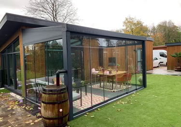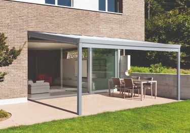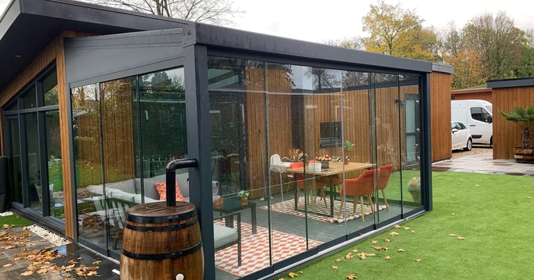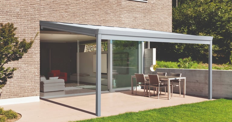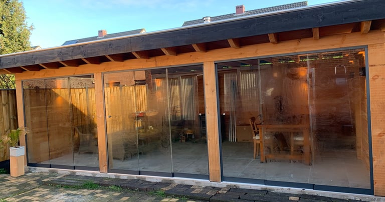 Onze glazen schuifwanden kunnen geplaatst worden onder uw houten of aluminium overkapping